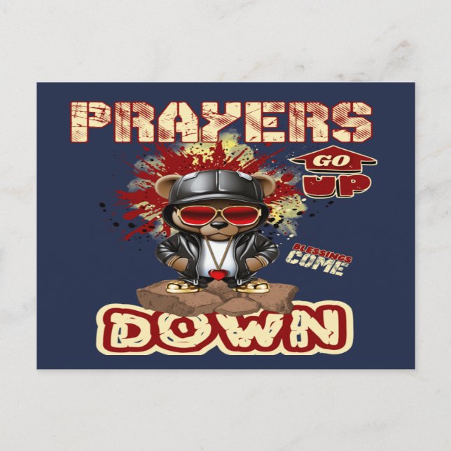 Spread some love and faith with this eye-catching postcard. It features a chill hip hop teddy bear reppin' the message "PRAYERS GO UP BLESSINGS COME DOWN" in sick fonts. Send this postcard to a friend or keep it for yourself as a reminder to stay positive.