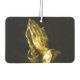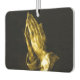 Praying hands in a bronze gold colour against a black background hanging air freshener