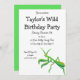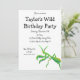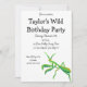 This invite features a painted illustration of a praying mantis in bright green with orange accents and is ready to be customised with all of your party details.