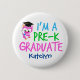 A cool personalised preschool graduation button for a little girl graduating from Pre-K and moving on to kindergarten. It features a cute pink owl wearing a graduation cap and carrying a scroll next to a fun font in blue, green, and pink.
