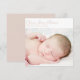 The front of the card displays a picture of your new baby daughter with her name in a precious rose colored script font. Templated to add her details along with your family names welcoming the new baby girl. The back of the photo card is a solid rose color.