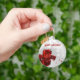A noble Christmas illustration: A red gift box with a red Christmas ball, ribbon and red pearls on a light white-grey bokeh background with stars.
