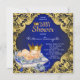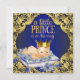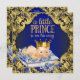 Royal blue and gold prince baby shower invitation with adorable baby boy with gold crown on a bed of blue roses and pillow on a beautiful royal blue and gold swirl background. This blue and gold prince baby shower invitation is easily customised for your event by adding your details in the font style and colour and wording of your choice.