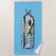 Cool beach towel, with graphic artwork of a great white shark trapped in a water bottle, against a blue swirl wave background. Customise to add your own text.