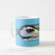 Cool ceramic mug, with graphic artwork of a great white shark trapped in a water bottle, against a blue swirl wave background. Customise to add your own text.