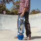Dd brand skateboard, with graphic artwork of a great white shark trapped in a water bottle, against a blue background. Customise to add your own text.