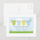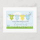A whimsical pregnancy announcement postcard with a row of baby clothes hung on a clothesline in a spring or summer setting, with grass and birds. Cute modern style. Add your due names and due expected due date. Soft pastel hues of yellow, green and blue.