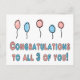 A fun pregnancy congratulations design shows the message "congratulations to all 3 of you!" with some hand drawn balloons above - all in pink and blue colors.