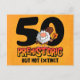 Funny 50th birthday design with smiling cartoon caveman holding a club and torch. Text says 50 PREHISTORIC BUT NOT EXTINCT. Distressed background. Personalise it with your own custom text. PinkInkArt original!