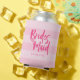 Keep your drink cans cool with this stylish can cooler featuring the word "Bridesmaid" in pink brush script against a pink stripes pattern background. It makes a great gift for bridesmaid. For other matching items see here https://www.zazzle.com/collections/brush_script_and_stripes-119702950275442900