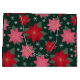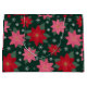 Wrap your Christmas gifts in this fun and festive holiday design featuring bold red and pink poinsettias with scattered snowflakes on a dark pine green background