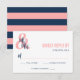 Preppy wedding RSVP in navy and coral pink, with Mr & Mrs written in a charming brush script over an ampersand. The back features a chic pattern of broad stripes.