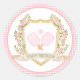 This sticker design has a watercolor image of a crest surrounded by branches with pink gingham pickleball paddles in the centre. There is a pink gingham border around the edge. Text says "Happy Birthday." Colours used include moss green, blush pink and and tan.