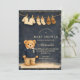 A charming preppy baby shower design featuring a sweet teddy bear dressed in a classic green plaid jacket and bow tie. Above the bear, a delicate clothesline displays tiny baby clothes and shoes, creating a nostalgic storybook nursery scene. The deep navy background and subtle tartan border add a refined, vintage-inspired touch that feels both elegant and playful. Perfect for a stylish baby shower celebration with a classic preppy aesthetic.