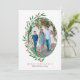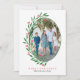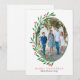 A whimsical and preppy holiday photo card featuring an oval Christmas wreath frame surrounding your family photo. Includes leaves and berries in red. Customise the holiday greeting and text at the bottom.