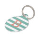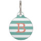 Two side Dog ID Tag with turquoise background on the front with white stripes and a serif elegant monogram. Back side hold dog name and owners phone number