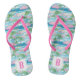 This flip flop design features a preppy beach print with a pink umbrella, palm trees and hibiscus flowers. You can personalise with your monogram.