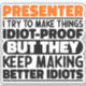 Funny Presenter Sayings "Presenter I Try To Make Things Idiot Proof But They Keep Making Better Idiots". Grab this Funny Presenter design as a funny gifts for an awesome mum, dad or friend.