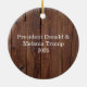Beautiful image of President Trump with his wife, with a decorative holly wreath frame and rustic wood background. President Donald J. Trump and First Lady Melania Trump at the White house during the swearing in of Supreme Court Justice Amy Coney Barrett in October 2020, the perfect gift for the Trump supporter as a nice decoration and expression of pro-America views and politics. Elegant holiday Christmas ornament with circle or your choice of shape.