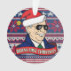 both sides of this political holiday humour double sided acrylic xmas tree ornament are identical and feature a cartoon of american president joe biden in sunglasses, a deep blue overcoat, and a santa hat, over a simulated knit background thats sort of retro americana beets ugly christmas sweater. The text on his lower band reads "BIDEN'S FIRST CHRISTMAS"