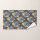 Pretty bath towel set design has large painted primary blue flowers with smaller ones in marigold yellow, purple and pink, all on a charcoal grey background giving it a dark and elegant look.