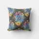 Pretty floral pillow design has large painted primary blue flowers with smaller ones in marigold yellow, purple and pink, all on a charcoal grey background giving it a dark and elegant look.