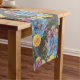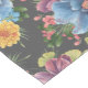 Beautiful table runner design has large painted primary blue flowers with smaller ones in marigold yellow, purple and pink, all on a charcoal grey background giving it a dark and elegant look.