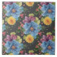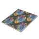 Beautiful ceramic tile has large painted primary blue flowers with smaller ones in marigold yellow, purple and pink, all on a charcoal grey background giving it a dark and elegant look. Matching items available for bed, bath and throughout the home