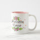 Awesome Mema coffee mug featuring pink flowers and pink scattered polka dots with a cute font. Visit our shop to view this design in a variety of grandmother names.