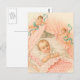 Beautiful baby in an ornate pink and white canopied bed. Two winged cherubs hover about his head.