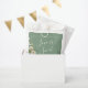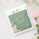 Pretty Spring/Summer wedding favour bag design features watercolor white daisies corner on basil green background with white customisable text blocks in modern fonts