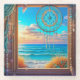 Pretty blue and tan dreamcatcher hanging in a window overlooking the beach with pretty white sand and blue waves.