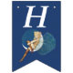 This flag shaped Happy Birthday bunting banner is dark blue with white letters and a pretty fairy with blonde hair and light blue wings sitting on a crescent moon wearing silk stockings. Customise the birthday year with the templates.