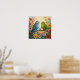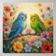 Cute poster wall art for bird lovers with impasto painting style blue and green parakeets and flowers.