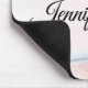 A mouse pad with beautiful blue flowers on a pink background. An image of a rectangle shaped notebook page layered over top for you to write your text inside.