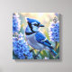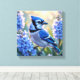 A beautiful bird themed wall art. Front has an ai illustration of a pretty Blue Jay sitting on a lilac branch.