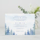 Invite your loved ones to a magical winter celebration with this enchanting wedding invitation, beautifully adorned with pretty pine trees softly blanketed in snow. The design captures the essence of snowy forest romance, combining rustic winter charm and the allure of an evergreen love story. Wisps of frosty blue and gentle forest green evoke nature’s winter beauty, while elegant, airy typography provides a refined, easy to read touch.