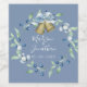 Beautiful dusty blue background with juniper wreath. Pretty elegant script with simple elegance for your sparkling wine bottles.