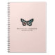 A pretty spiral notebook with a creative pink, aqua blue and black watercolor butterfly design on a blush pink background. Designed for yoga teachers, aestheticians, cosmetologists, massage therapists and healing arts professionals.