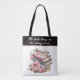 Book themed tote bag, with pretty artwork of colourful pastel books, with flowers and a pair of glasses, on top. Custom text reads No such thing as too many books, and can be personalised to read what you want. Great gift idea for any book lover.