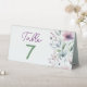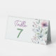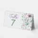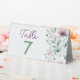 Beautiful personalised wedding table number tents. An elegant watercolor plum purple flowers with sage green and dusty blue foliage and floral design. Edit the text in the personalise area.