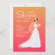 This beautiful bride shower invitation is featured in a floor length gown with a train and veil and holding a bouquet of flowers against a hot pink to peach gradient background. (Vecteezy.com - wedding by freevoctor). The card is easy to customise with your wording, font, font colour, paper shape options and choice of six paper types.