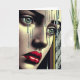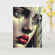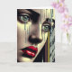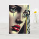 Blank card. Ai art on card is a sad woman with tears in her eyes looking out the window watching it rain.