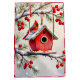 A beautiful Christmas gift bag with an illustration of a red cardinal on a birdhouse surrounded by pine tree branch with red berries and snow.