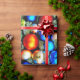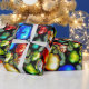 Very pretty Holiday ornaments in blue, red, green, silver and gold rest among Pine Tree branches.