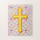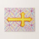 This pretty puzzle features my original digital art of a vintage floral pattern reworked into a zany and colorful appearance for the background, with a vintage illustrated gold cross in front of the pattern. The size of this unique puzzle is 11” x 14”, and in the ‘challenging’ category, however you may size up or down as desired.