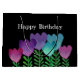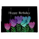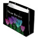 Cute and pretty Happy Birthday gift bag with pink, blue and purple flowers and green leaves on a black background.
