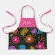 This bold, colourful kids' apron features a hand drawn floral design in magenta / fuchsia pink, orange, golden yellow, purple, blue, and green over a custom colour background (shown in black). A text template is included for personalisation, making this apron a great gift for any special occasion or holiday!