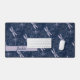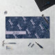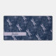 Pretty personalised desk mat features light lilac dragonflies on navy blue background. Customise with name or monogram.