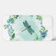 A beautiful dragonfly with a border made of a mix of blue, teal and green watercolor painted flowers and butterflies.
